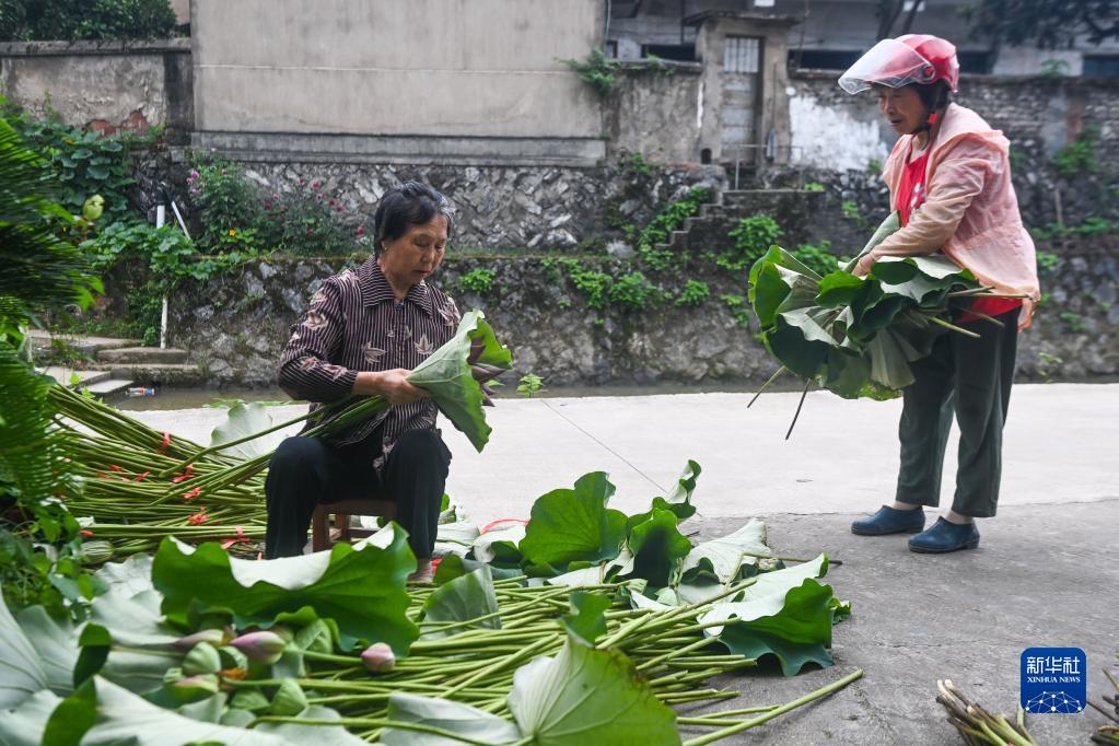 Dorfbewohner sortieren und verpacken frisch gepflückte Lotusblumen und Samenkapseln der Lotusblüte. (Foto vom 6. Juli 2023, Xinhua)