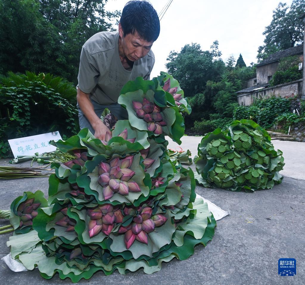 Dorfbewohner sortieren und verpacken frisch gepflückte Lotusblumen und Samenkapseln der Lotusblüte. (Foto vom 6. Juli 2023, Xinhua)