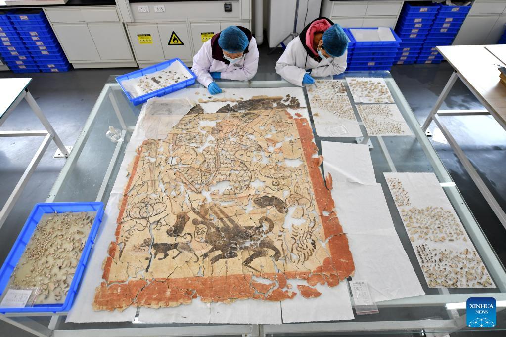 Techniker des Yungang-Grotten-Forschungsinstituts restaurieren am 9. Mai 2021 ein Stück Wandmalerei in ihrem Atelier in Datong. (Xinhua/Zhan Yan)