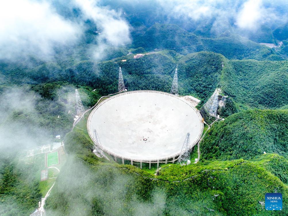 Diese Luftaufnahme vom 22. Juni 2023 zeigt das chinesische sphärische Radioteleskop mit fünfhundert Metern Öffnung (FAST) in der südwestchinesischen Provinz Guizhou. (Xinhua/Ou Dongqu)