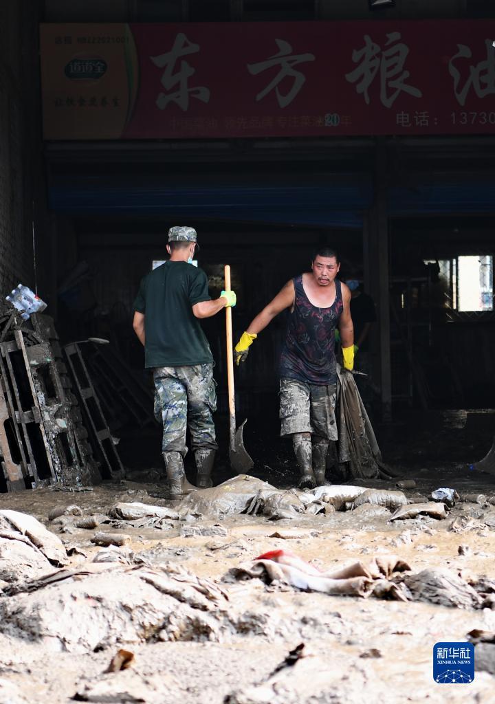 Zwei Händler entfernen Müll und Schlamm vom Großmarkt.(Foto vom 9. August 2023, Foto: Zhu Xudong/ Xinhua)