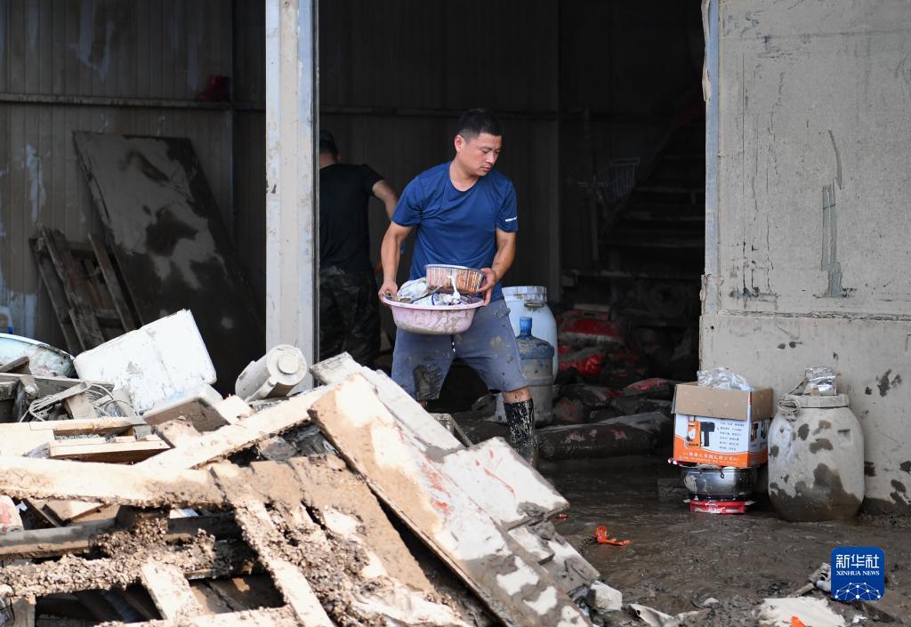 Ein Händler bei der Entfernung von Müll und Schlamm.(Foto vom 9. August 2023, Foto: Zhu Xudong/ Xinhua)