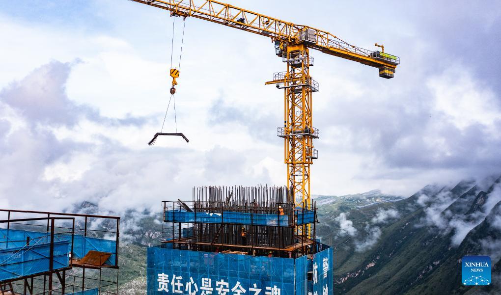 Diese Luftaufnahme vom 2. August 2023 zeigt die Baustelle der Huajiang-Brücke über die Große Schlucht in der südwestchinesischen Provinz Guizhou. (Xinhua/Tao Liang).