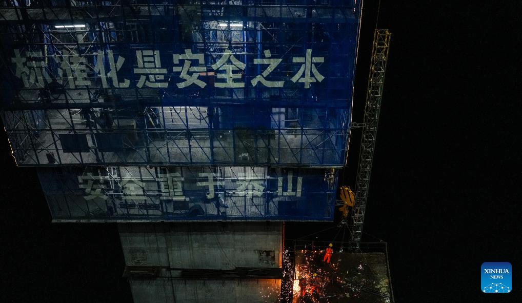 Arbeiter sind am 3. August 2023 auf der Baustelle der Huajiang-Brücke über die Große Schlucht (Huajiang grand canyon bridge) in der südwestchinesischen Provinz Guizhou beschäftigt. (Xinhua/Tao Liang)