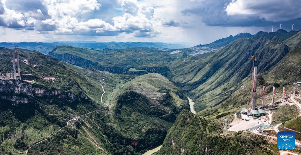 Diese Luftaufnahme vom 2. August 2023 zeigt die Baustelle der Huajiang-Brücke über die Große Schlucht in der südwestchinesischen Provinz Guizhou. (Xinhua/Tao Liang).