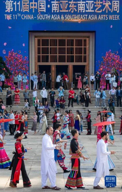 Teilnehmer und Künstler tanzen gemeinsam auf der Eröffnungszeremonie der China – Süd-und Südostasien- Kunstwoche. (Foto vom 15. August, Chen Xinbo/Xinhua)