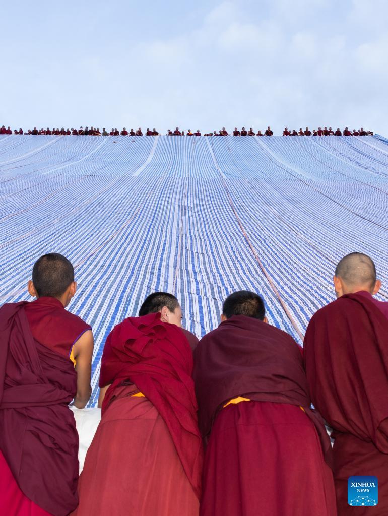 Mönche bereiten sich am 16. August 2023 im Drepung-Kloster in Lhasa in der Autonomen Region Tibet auf die Zeremonie der „Sonnenbestrahlung des Buddha“ vor. (Foto von Tenzin Nyida/Xinhua)