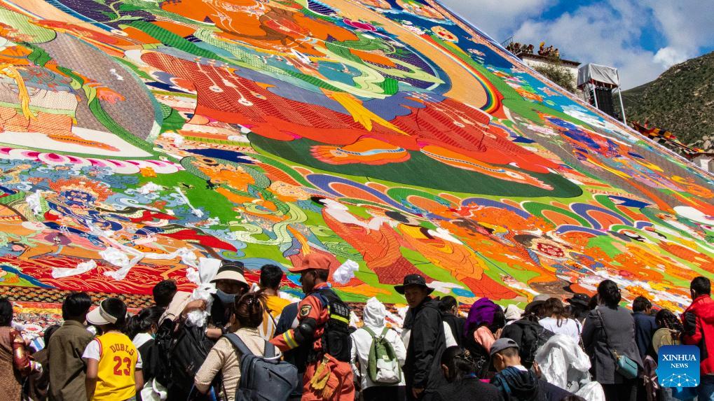 Gläubige und Besucher betrachten am 16. August 2023 ein riesiges Thangka-Gemälde während der „Sonnenbestrahlung des Buddha“-Zeremonie im Drepung-Kloster in Lhasa. (Foto: He Bingjie/Xinhua)