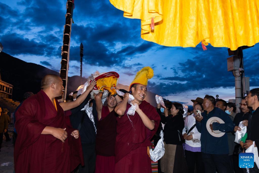 Mönche tragen am 16. August 2023 ein riesiges Thangka-Gemälde im Drepung-Kloster in Lhasa. (Foto von Tenzin Nyida/Xinhua)