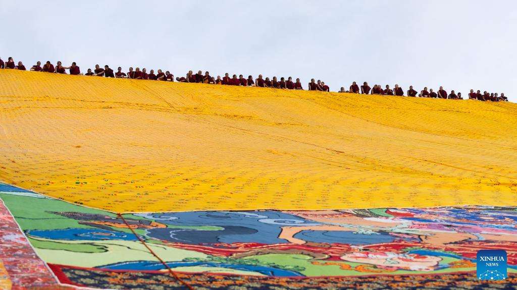 Mönche heben am 16. August 2023 einen großen gelben Vorhang vor einem riesigen Thangka-Gemälde während der „Sonnenbestrahlung des Buddha“-Zeremonie im Drepung-Kloster in Lhasa. (Foto von Tenzin Nyida/Xinhua)