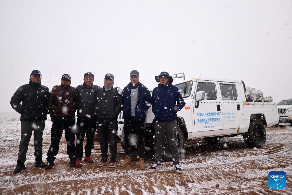 Mitarbeiter der Schutzstation des Drolkar-Sees des Verwaltungsbüros von Hoh Xil stellen sich am 16. Juni 2023 in Hoh Xil in der nordwestchinesischen Provinz Qinghai zum Gruppenfoto auf. (Xinhua/Zhang Hongxiang)