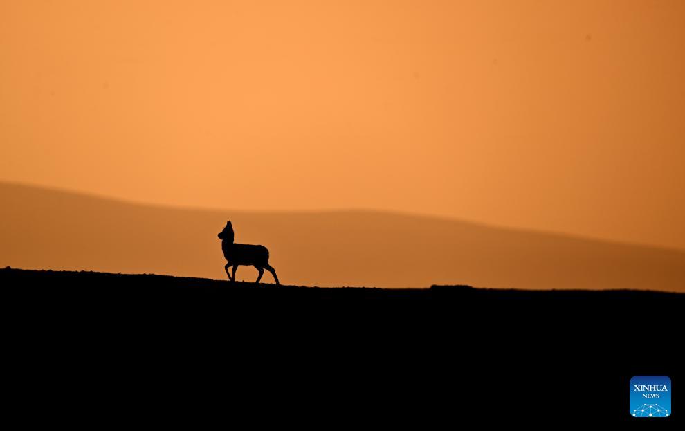 Eine weibliche tibetische Antilope ist am 18. Juni 2023 im Gebiet des Drolkar-Sees in Hoh Xil zu sehen. (Xinhua/Zhang Hongxiang)