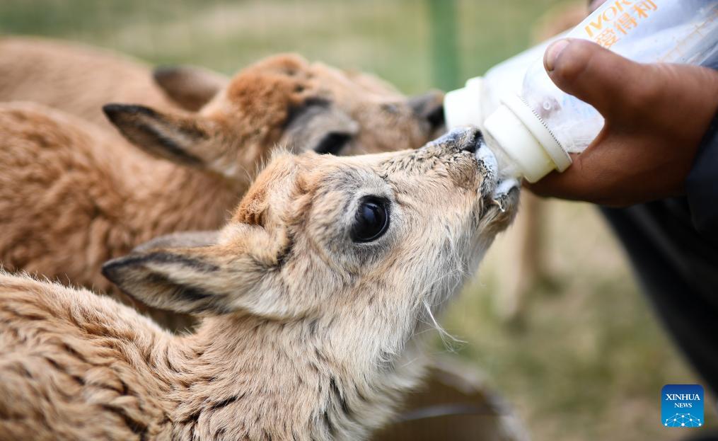 Ein Mitarbeiter des Verwaltungsbüros von Hoh Xil füttert am 28. Juli 2023 gerettete tibetische Antilopenkälber in Hoh Xil in der nordwestchinesischen Provinz Qinghai. (Xinhua/Zhang Hongxiang)