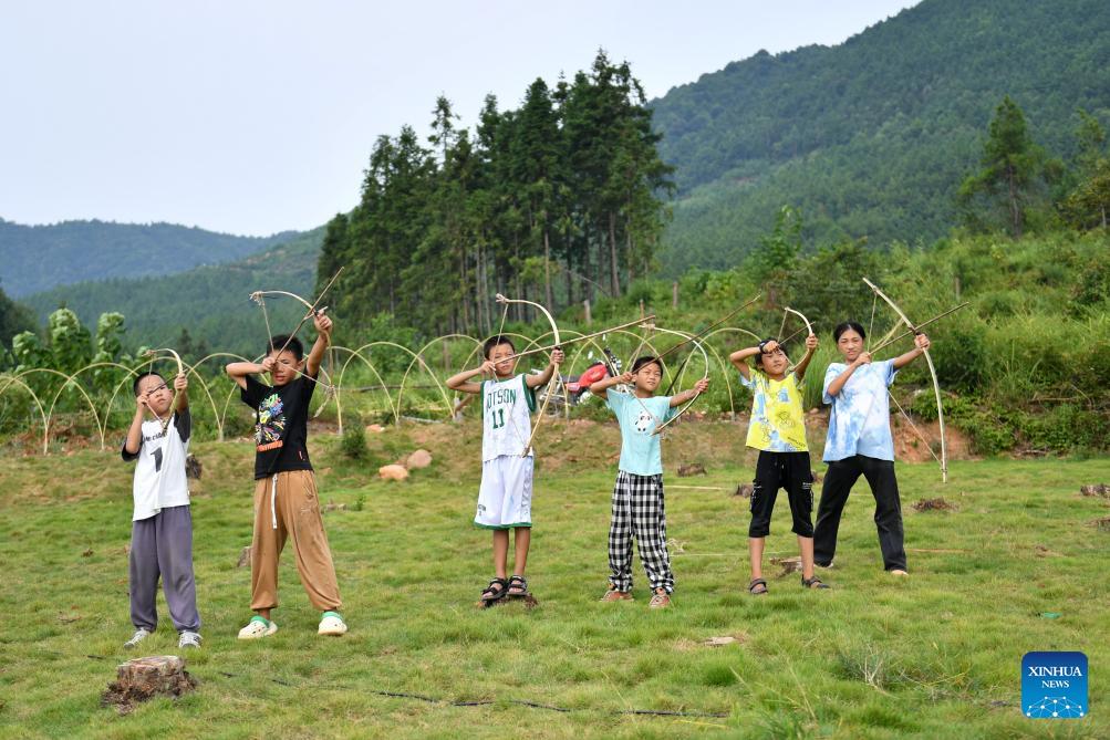 Kinder probieren selbst hergestellte Spielzeugbögen und -pfeile aus. (Foto vom 19. August 2023, Xinhua)