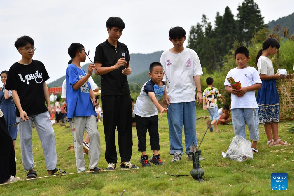 Kinder spielen das Touhu-Spiel. Bei der antiken Unterhaltungsform müssen die Spieler Pfeile in einen Topf werfen. (Foto vom 20. August 2023, Xinhua)