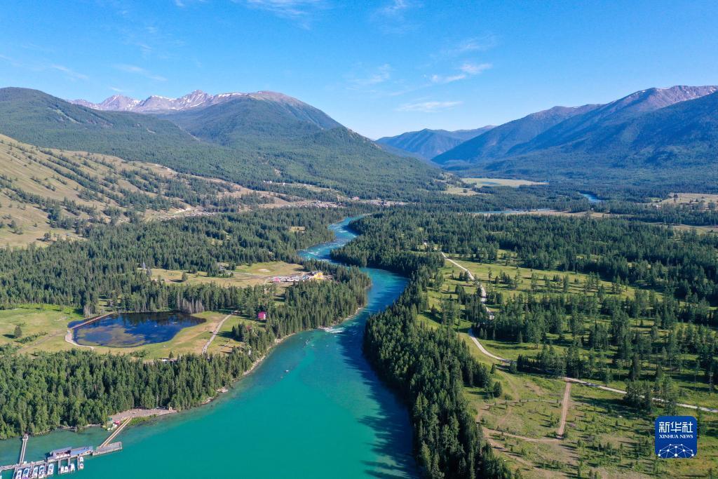 Die Luftaufnahme zeigt die wunderschöne Landschaft in Kanas in Xinjiang. (Foto vom 19. Juli 2023, Xinhua)