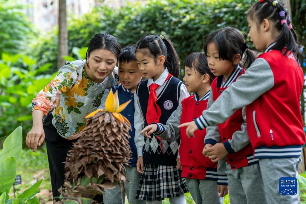 Schülerinnen und Schüler besuchen unter Anleitung einer Lehrerin ein Demonstrationsprojekt zur Biodiversität. (Foto vom 27. August 2023, Hu Chao/ Xinhua)