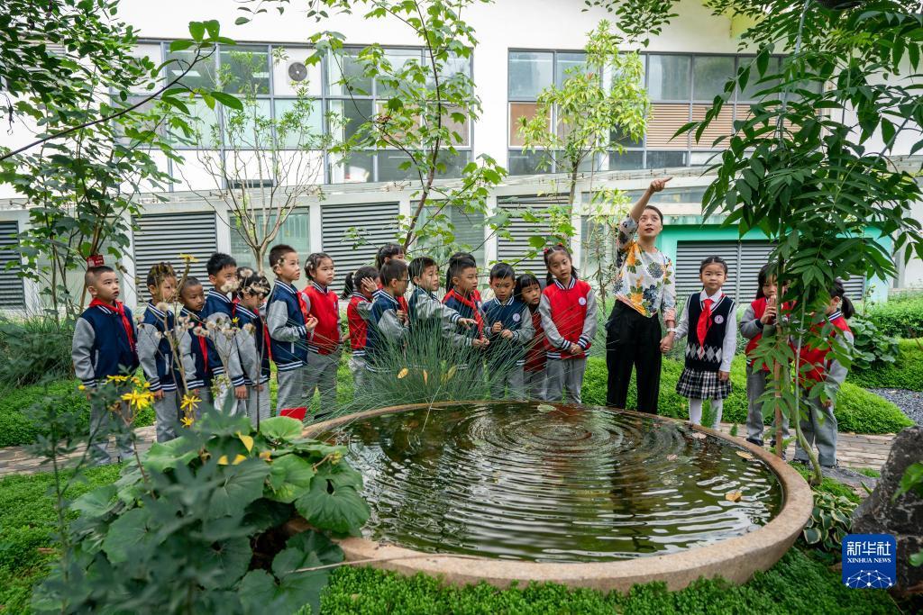 Schülerinnen und Schüler besuchen unter Anleitung einer Lehrerin ein Demonstrationsprojekt zur Biodiversität. (Foto vom 27. August 2023, Hu Chao/ Xinhua)