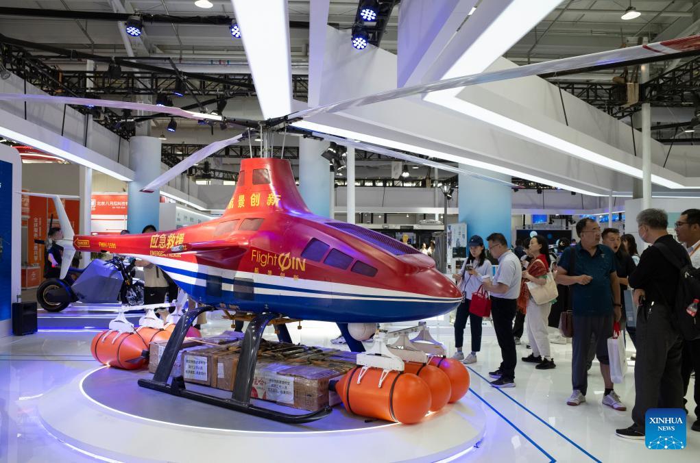 Besucher beobachten einen unbemannten Hubschrauber. (Foto vom 5. September 2023, Xinhua)