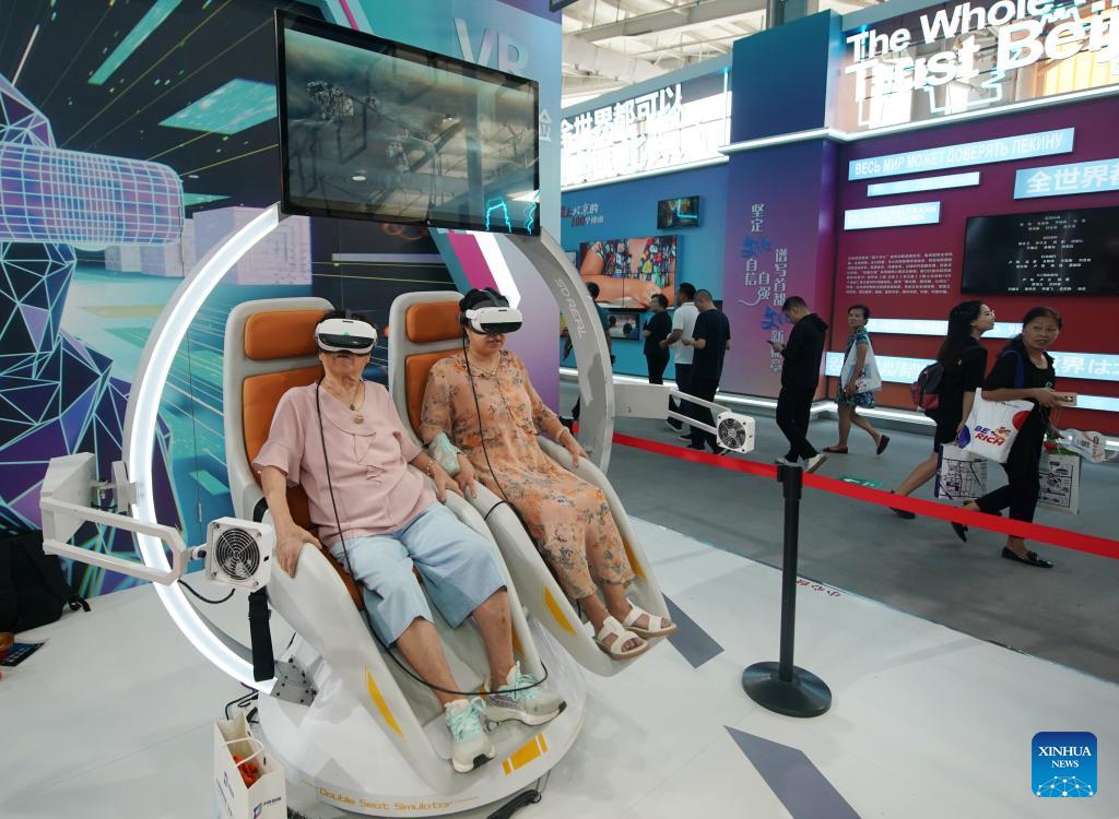 Besucher probieren VR-Geräte aus. (Foto vom 5. September 2023, Xinhua)