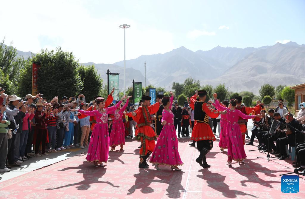 Mitglieder eines lokalen Gesangs- und Tanzensembles tanzen am 4. September 2023 zur Begrüßung von Touristen vor dem Kundendienstzentrum des Pamir-Tourismusgebiets im tadschikischen Autonomen Kreis Taxkorgan in der nordwestchinesischen Uigurischen Autonomen Region Xinjiang. (Xinhua/Cheng Tingting)