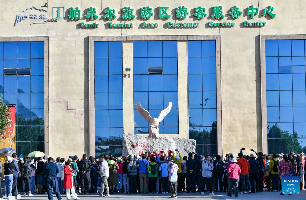 Touristen sehen sich am 31. August 2023 eine Aufführung vor dem Kundendienstzentrum des Pamir-Tourismusgebiets in der nordwestchinesischen Uigurischen Autonomen Region Xinjiang an. (Xinhua/Hu Huhu)