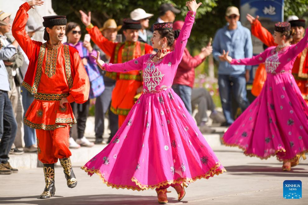 Mitglieder eines lokalen Gesangs- und Tanzensembles tanzen am 4. September 2023 zur Begrüßung von Touristen vor dem Kundendienstzentrum des Pamir-Tourismusgebiets im tadschikischen Autonomen Kreis Taxkorgan in der nordwestchinesischen Uigurischen Autonomen Region Xinjiang. (Xinhua/Wang Fei)