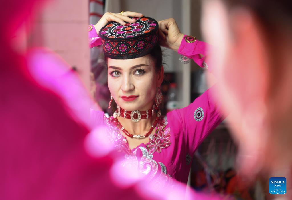 Ein Mitglied eines lokalen Gesangs- und Tanzensembles bereitet sich am 4. September 2023 vor einer Aufführung im Kundenservicezentrum des Pamir-Tourismusgebiets in der nordwestchinesischen Uigurischen Autonomen Region Xinjiang vor. (Xinhua/Wang Fei)