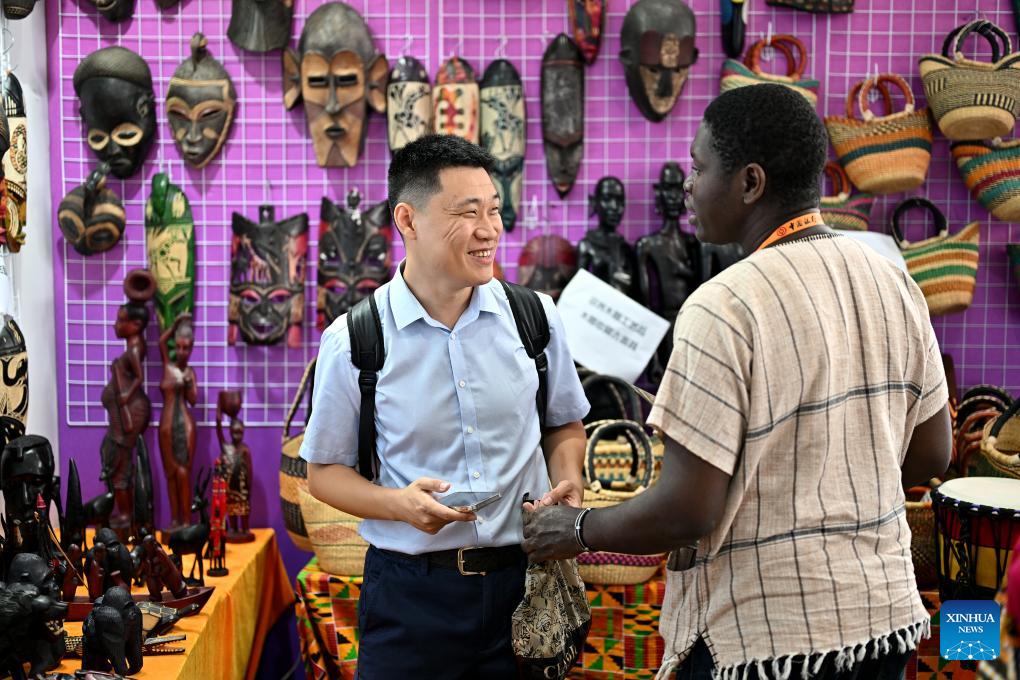 Ein Besucher kauft Kunsthandwerke aus Uganda. (Foto vom 6. September 2023, Xinhua)