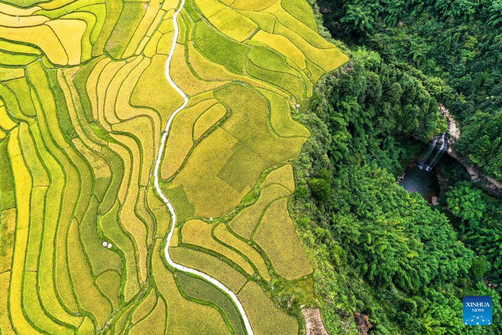 Das Luftbild zeigt die Lali-Terrassenfelder im Kreis Guiding in Guizhou. (Foto vom 7. September 2023, Xinhua)