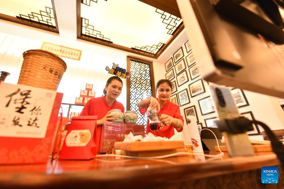 Mitarbeiter verkaufen Teeprodukte per Livestreaming in Wuzhou. (Foto vom 25. August 2023, Xinhua)