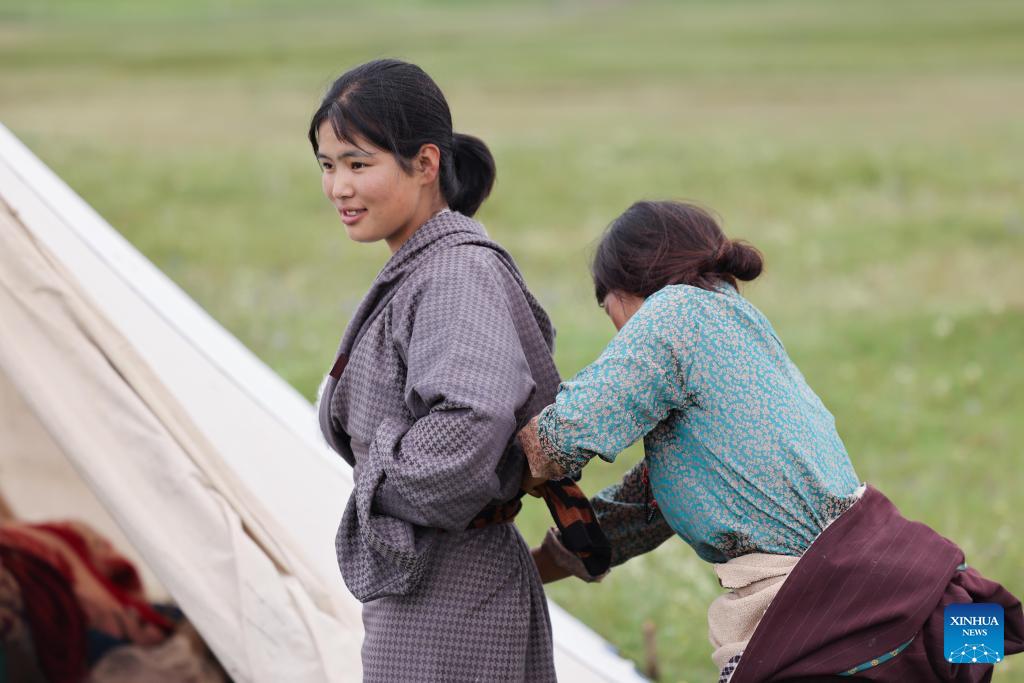 Tashi Choepels Frau Dougekyi (R) ordnet am 17. August 2023 im Dorf Duosong Kleidung für ihre Tochter. (Xinhua/Wang Jingyi)