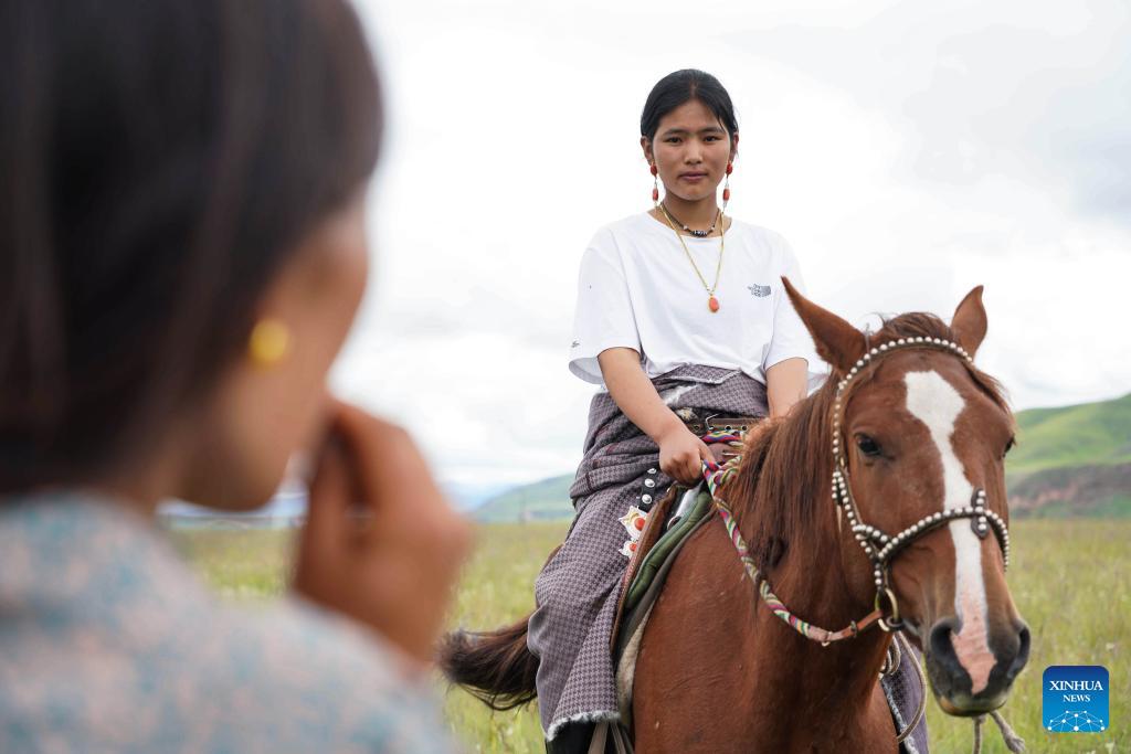 Tashi Choepels Tochter Rinchen Dolma (R) unterhält sich am 17. August 2023 mit ihrer Mutter im Dorf Duosong. (Xinhua/Wang Jingyi)