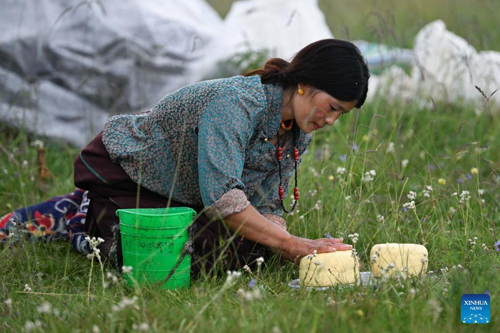 Tashi Choepels Frau Dougekyi macht am 17. August 2023 im Dorf Duosong Butter. (Xinhua/Wang Jingyi)