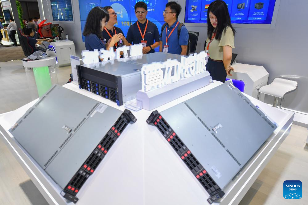 Besucher lernen während der diesjährigen World Computing Conference in Changsha in der zentralchinesischen Provinz Hunan am 15. September 2023 etwas über KI-Server.