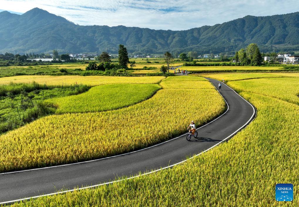 Eine Frau reitet am 2. September 2023 in der Nähe des alten Dorfes Guanlu im Kreis Yixian der Stadt Huangshan in der ostchinesischen Provinz Anhui. (Foto von Shi Yalei/Xinhua)
