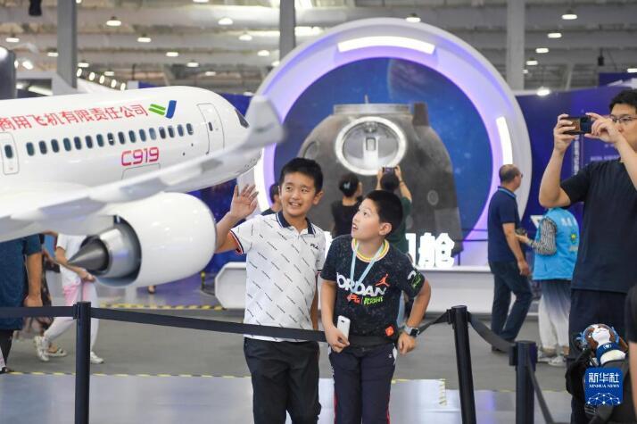 Zwei Junge interessieren sich für die Modelle der C919-Flugzeuge. (Foto vom 17. September, Ju Huanzong/Xinhua)