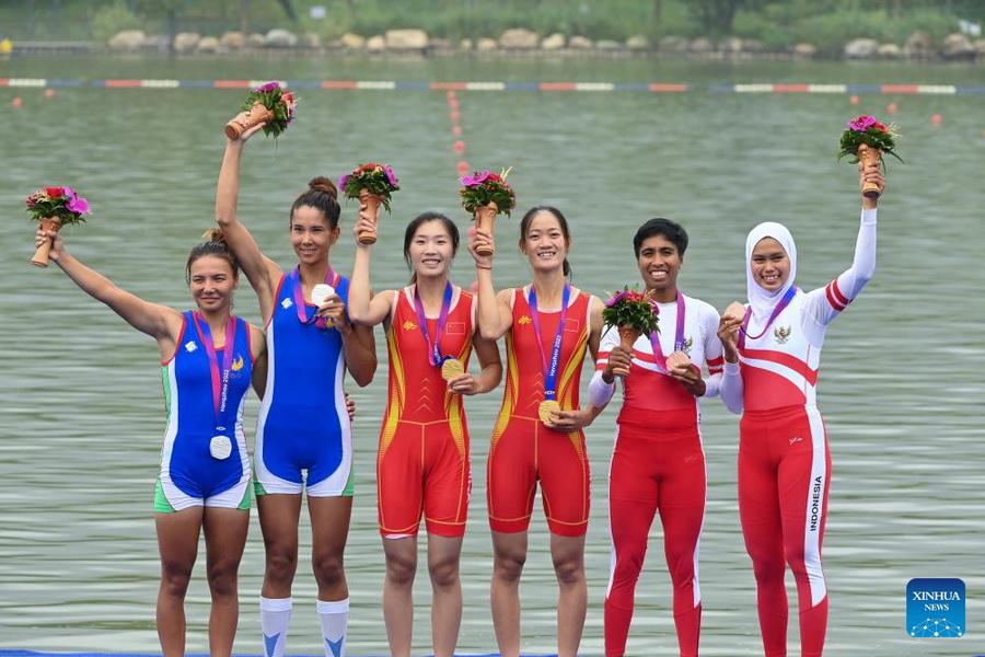 Die Goldmedaillengewinnerinnen Zou Jiaqi/Qiu Xiuping (Mitte) aus China, die Silbermedaillengewinnerinnen Luizakhon Islomova/Malika Tagmatova (l.) aus Usbekistan und die Bronzemedaillengewinnerinnen Chelsea Corputty/Mutiara Rahma Putri aus Indonesien posieren während der Siegerehrung des Leichtgewicht-Doppelzweier-Ruderns der Frauen. (Foto: Xinhua)