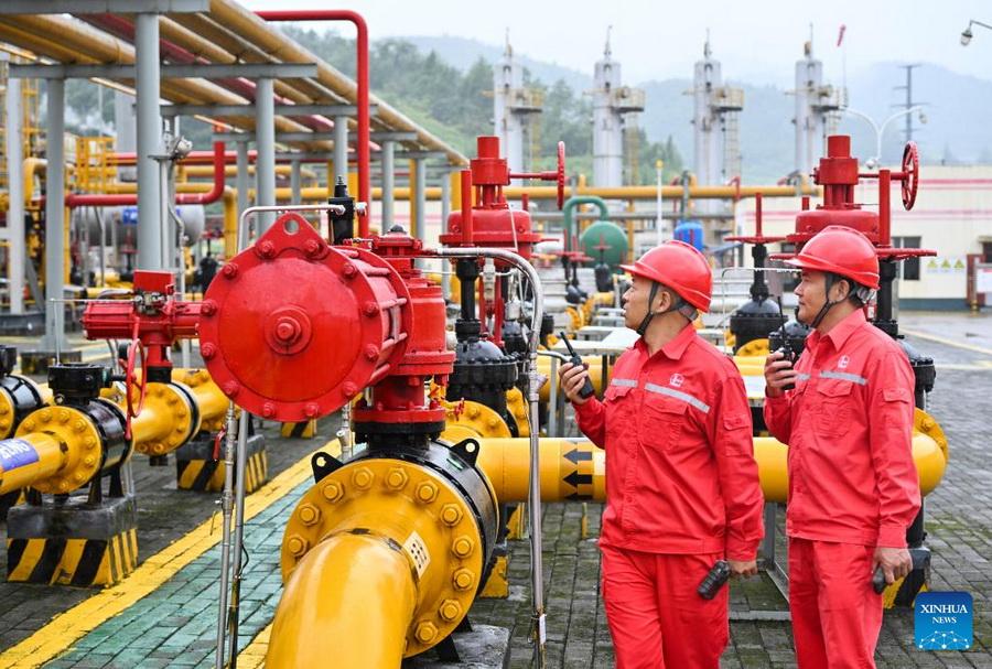 Techniker überprüfen am 21. September 2023 die Ausrüstung in einem Gasterminal des Fuling-Schiefergasfeldes in Fuling im südwestchinesischen Chongqing. (Foto: Xinhua)