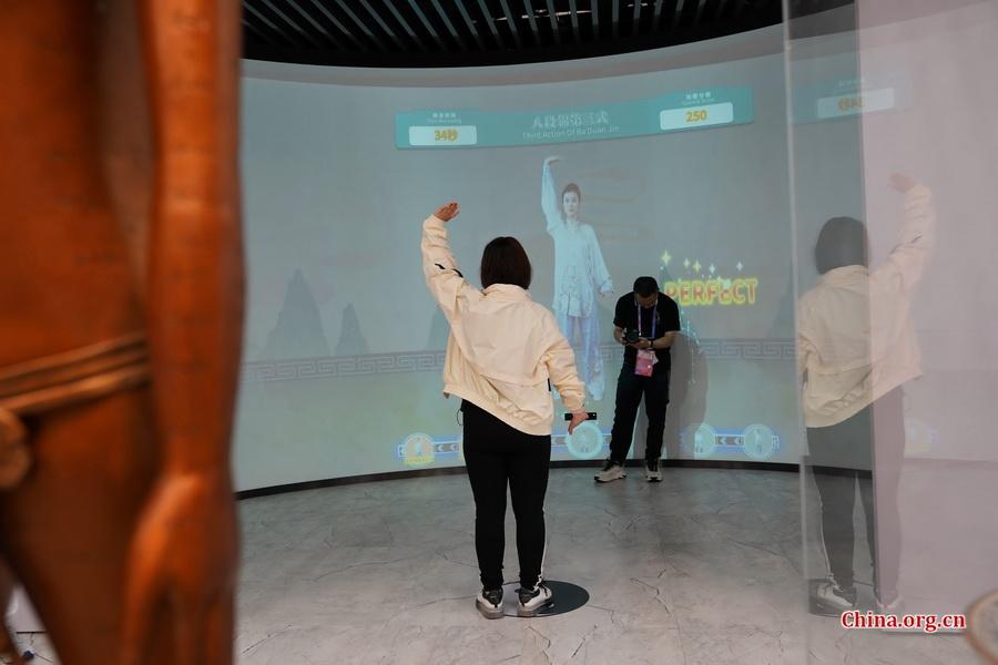Eine thailändische Reporterin erlebt im Hauptmedienzentrum eine virtuelle, von einem Lehrer geleitete Baduanjin-Unterrichtseinheit (eine traditionelle chinesische Körper-Geist-Aerobic-Übung). (Foto: Wang Yiming/China.org.cn)