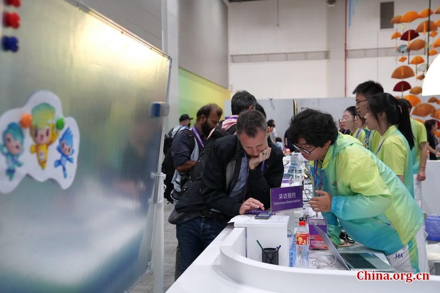 Ein Journalist erkundigt sich im Hauptmedienzentrum. (Foto: Wang Yiming/China.org.cn)
