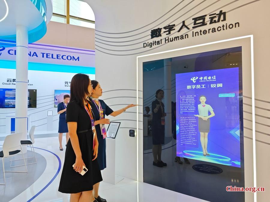 Ein Gerät zur Interaktion mit einer von KI erzeugten „Mitarbeiterin" wird präsentiert. (Foto: Wang Yiming/China.org.cn)