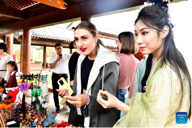 Zwei Besucherinnen bei einer Kunsthandwerkausstellung im Rahmen des 9. Nishaner Forums über Weltzivilisationen in Qufu. (Foto vom 26. September, Guo Xulei/Xinhua)