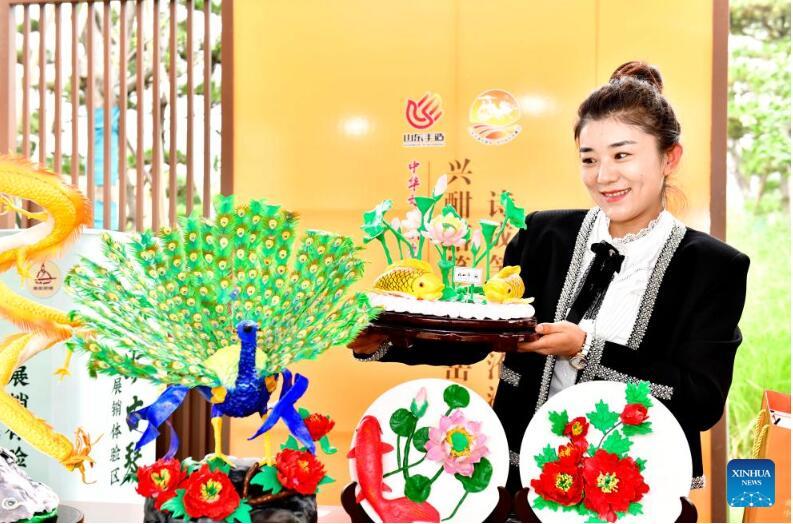 Eine Mitarbeiterin zeigt ein Kunstwerk aus Teig. (Foto vom 26. September, Guo Xulei/Xinhua)