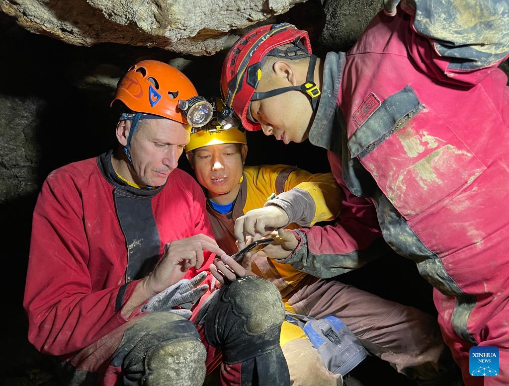 Mitglieder des Instituts für Bergressourcen der Provinz Guizhou führen am 24. September 2023 eine Expedition in eine Nebenhöhle der Shuanghe-Höhle in der südwestchinesischen Provinz Guizhou durch. (Foto von Luo Fei/Xinhua)