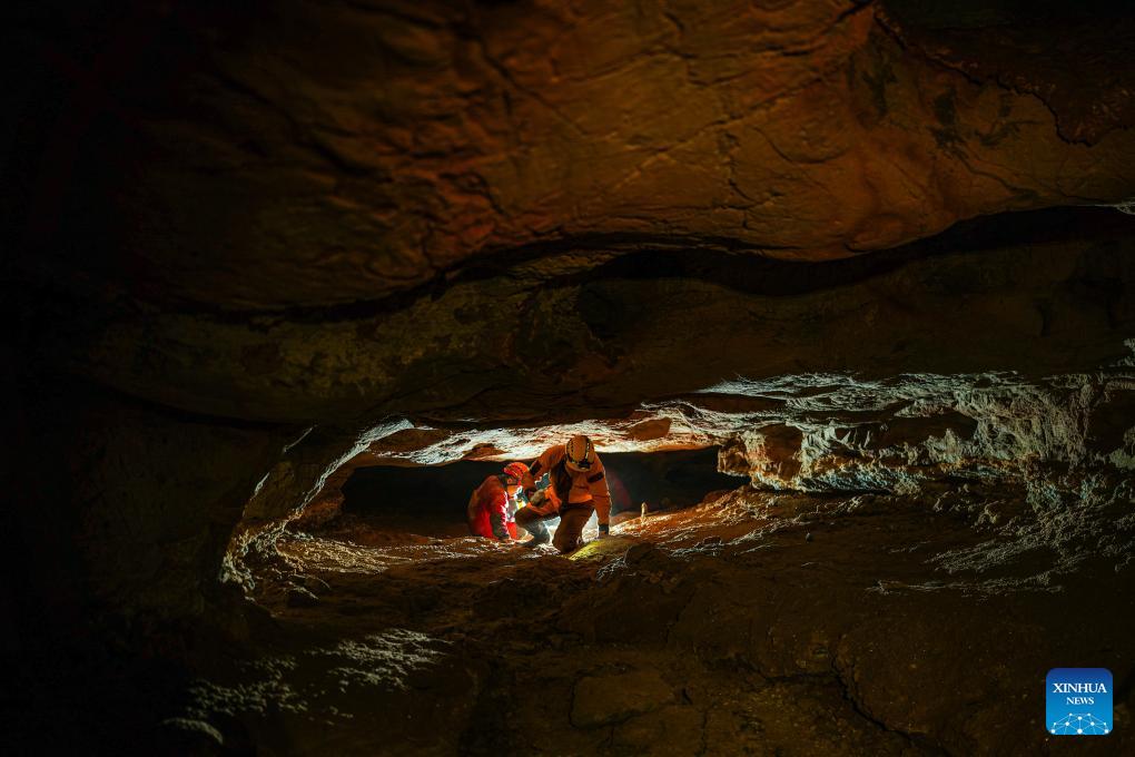 Mitglieder des Instituts für Bergressourcen der Provinz Guizhou führen am 23. September 2023 eine Expedition in eine Nebenhöhle der Shuanghe-Höhle in der südwestchinesischen Provinz Guizhou durch. (Foto von Zhao Fei/Xinhua)