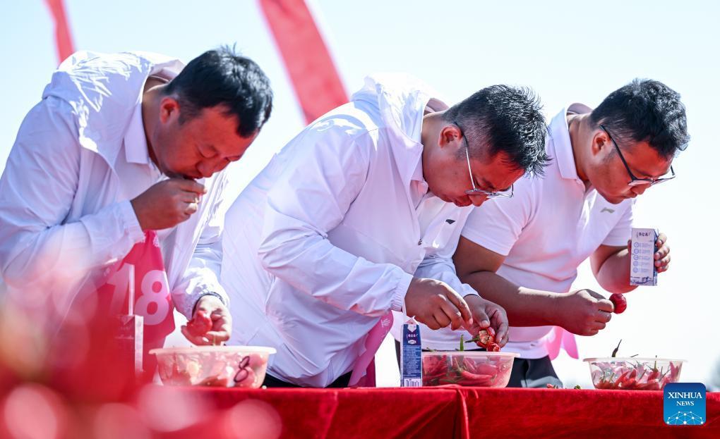 Menschen nehmen an einem Paprika-Esswettbewerb teil. (Foto vom 26. September 2023, Xinhua/Peng Yuan)