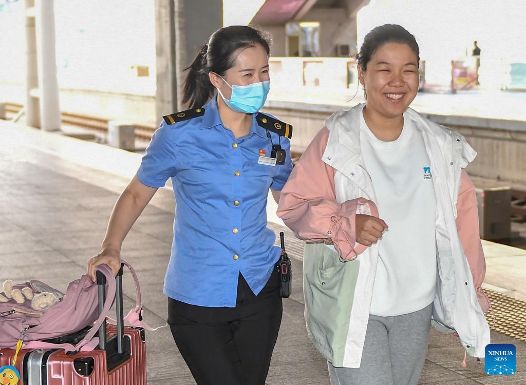 Eine Mitarbeiterin hilft einer sehbehinderten Fahrgästin am Bahnhof Changchun in der gleichnamigen Stadt in der nordostchinesischen Provinz Jilin. (Xinhua/Zhang Nan)