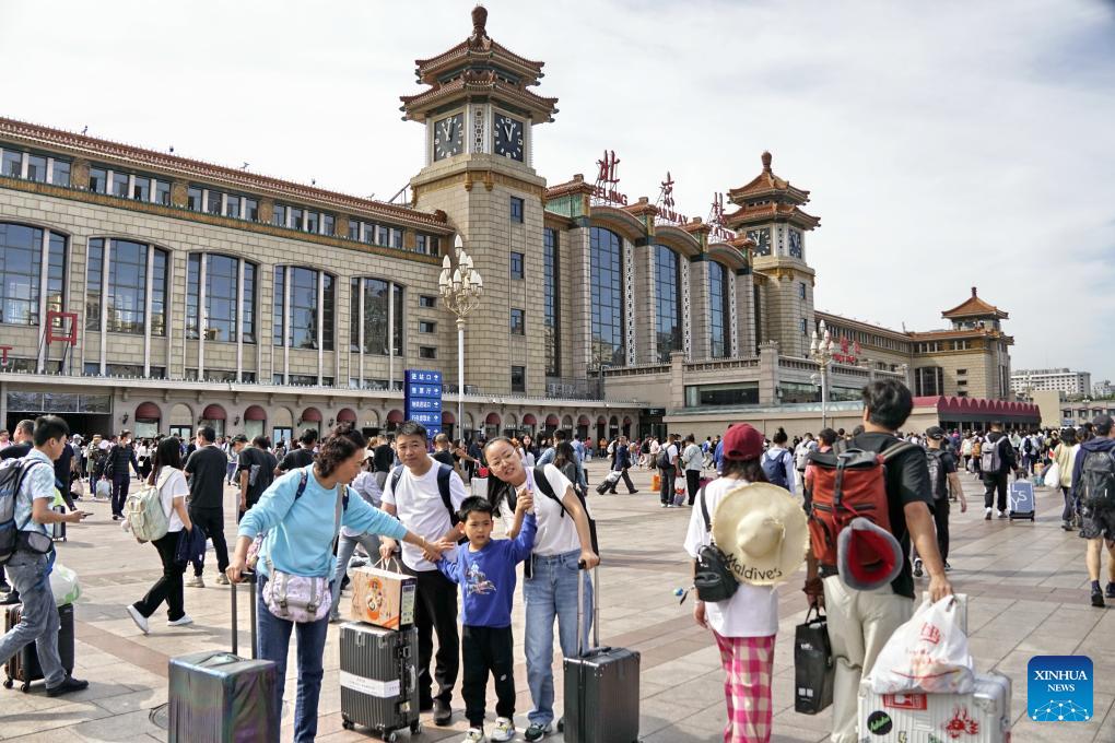Fahrgäste stehen auf dem Platz vor dem Hauptbahnhof in Beijing. (Foto vom 28. September, Xinhua/Li Xin)