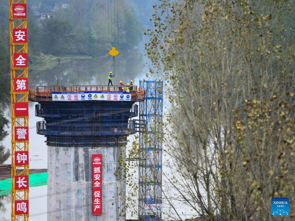 Arbeiter arbeiten am 30. September 2023 auf einer Baustelle der Hochgeschwindigkeitsstrecke Chengdu-Dazhou-Wanzhou in Dazhou in der südwestchinesischen Provinz Sichuan. (Xinhua/Wang Xi)